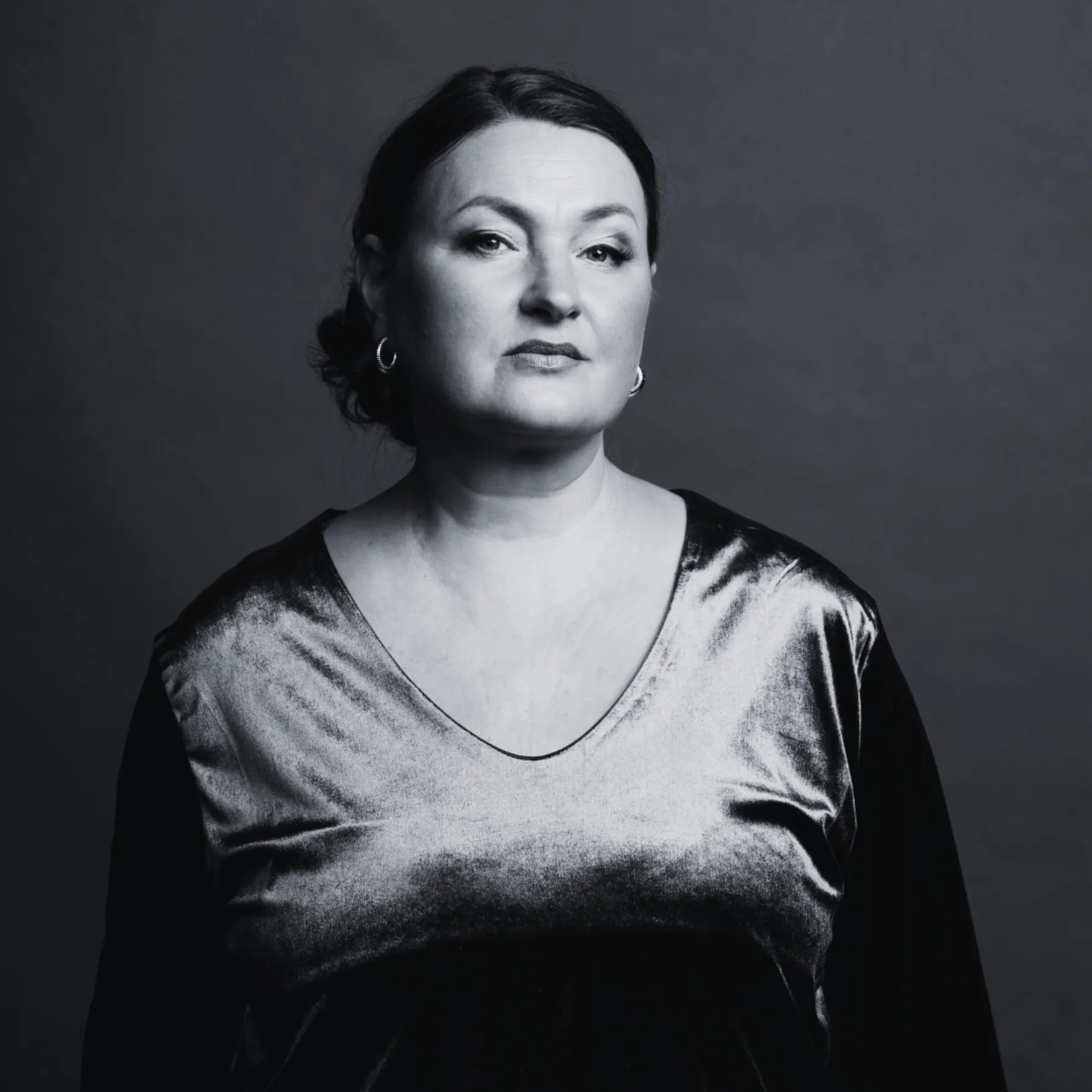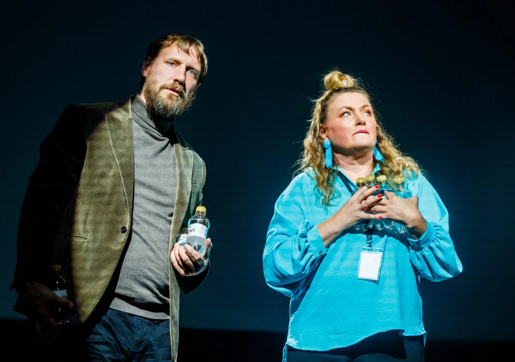 Esityskuvia näytelmästä "KIRJAMESSUT – Eli haastattelu, joka meni päin helvettiä" (Suomen Komediateatteri / Peacock-näyttämö), kotimainen kantaesitys 25.9.2025. Rooleissa näyttelijät Ria Kataja ja Pekka Strang, Ohjaaja Anna Dahlman.